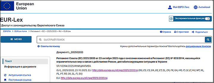 Сайт Евросоюза (eur-lex.europa.eu) – скриншот страницы с новым антирусским регламентом, автоперевод