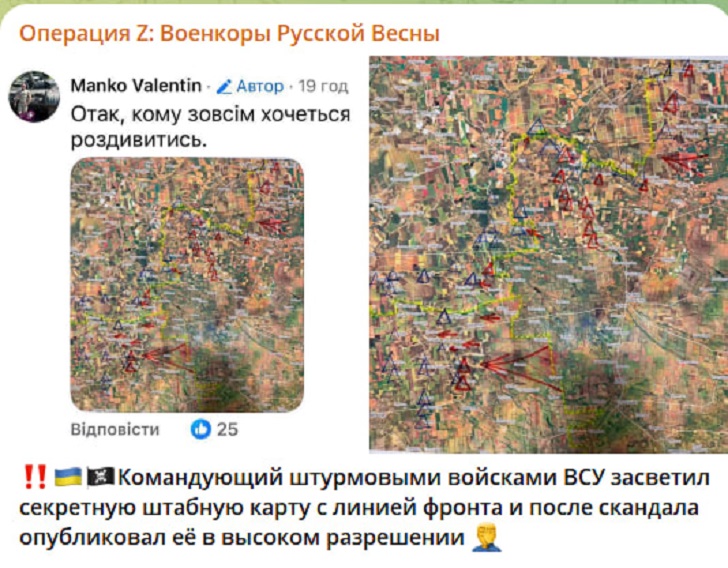 Генерал сдал планы Генштаба. Предательство или глупость? Новый командующий штурмовыми войсками ВСУ Валентин Манько случайно слил секретные карты украинского Генштаба в высоком разрешении, которые, мягко говоря, сильно отличаются от официальных сводок. Теперь украинцы спорят - предательство или глупость. Сам он прокомментировал свою публикацию в социальных сетях словами: "Тем, кому совсем хочется рассмотреть".