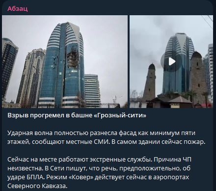 Сегодня утром грянул взрыв в башне "Грозный-Сити" в Чечне. Ударная волна разрушила фасад минимум пяти этажей небоскрёба. Начался пожар. Рассказываем, что известно к этому часу.